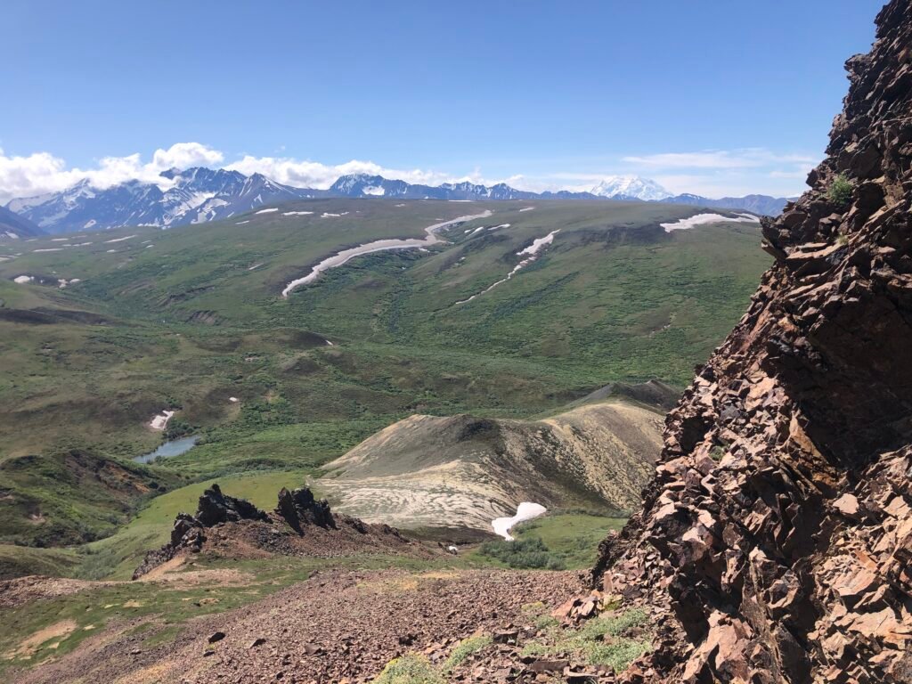 I sat on a lichen-covered rock, looking out over rolling green hills and jagged peaks. On the horizon, Denali stood exposed by the July sun, its snow-covered slopes cutting the deep blue sky. From that height, the landscape revealed itself in layers and textures no flat map could ever do justice.